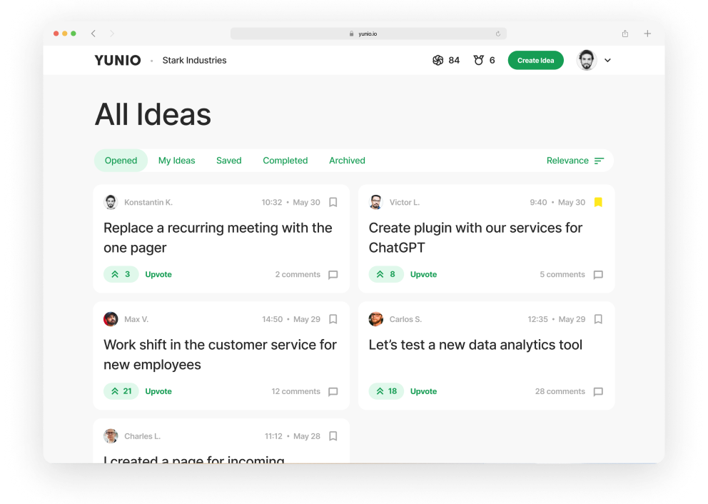 Yunio is a new approach to employee engagement for organizations. We are providing a space where employees can propose ideas, share feedback, and find solutions together to drive positive change in their work.